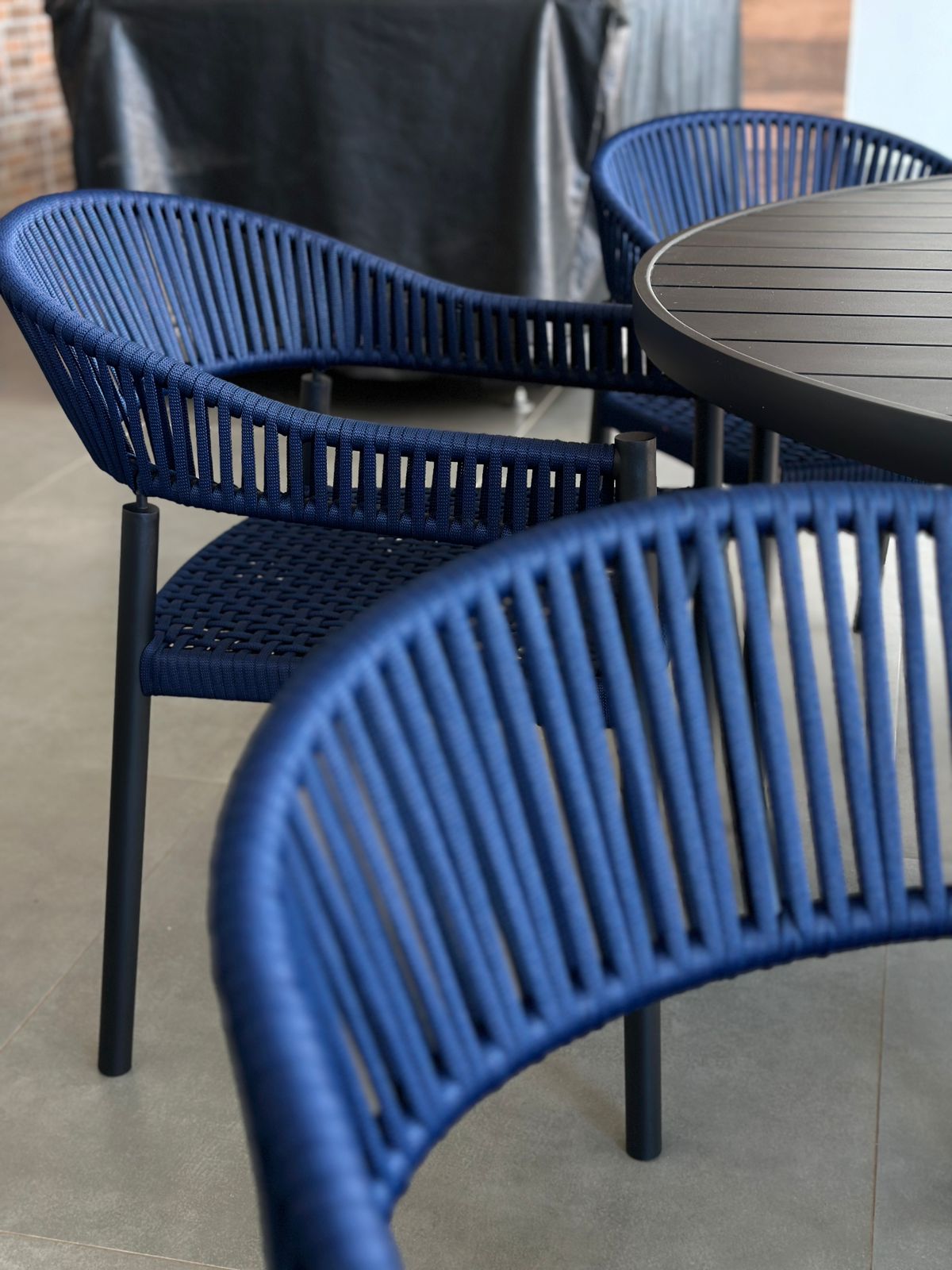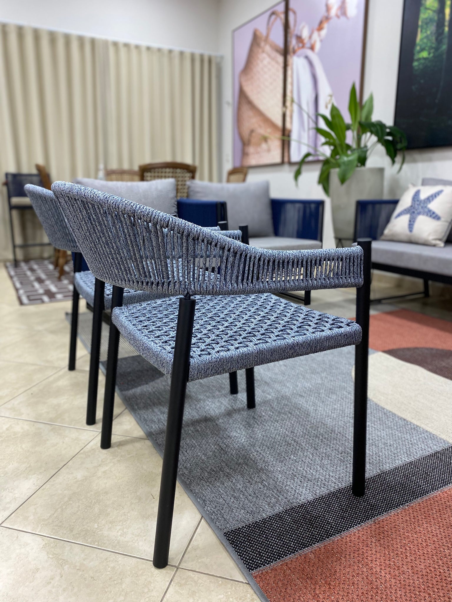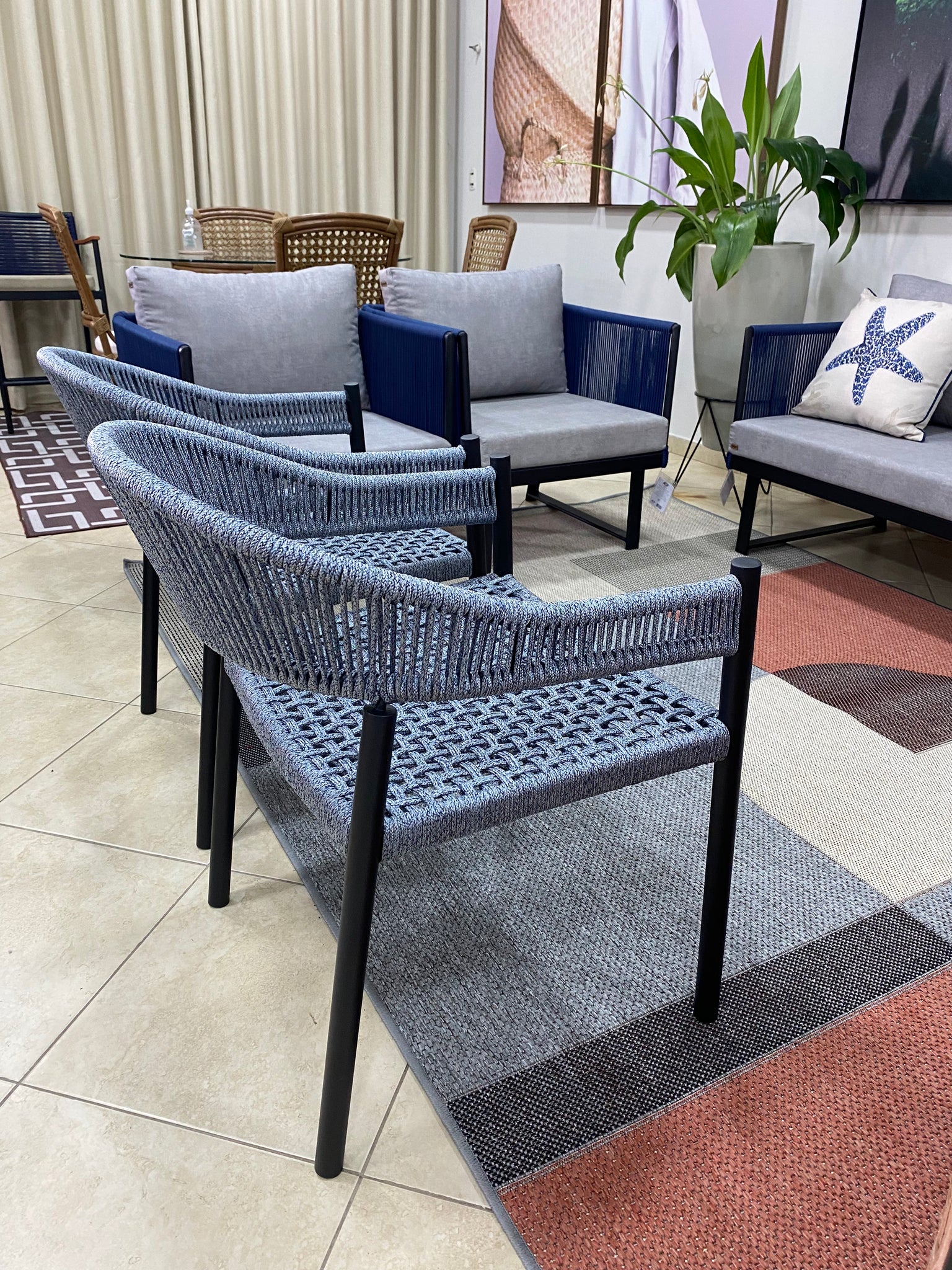Este móvel é fabricado com estrutura de alumínio soldado e confeccionado artesanalmente com fibra sintética, por isso pode ficar tanto na área interna quanto externa, sendo resistentes a sol, chuva e raios UV. O tecido usado é o AcquaBlock impermeável.