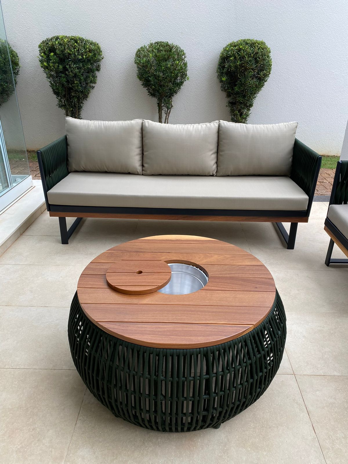 Este móvel é fabricado com estrutura de alumínio soldado e confeccionado artesanalmente com fibra sintética, por isso pode ficar tanto na área interna quanto externa, sendo resistentes a sol, chuva e raios UV. O tecido usado é o AcquaBlock impermeável.