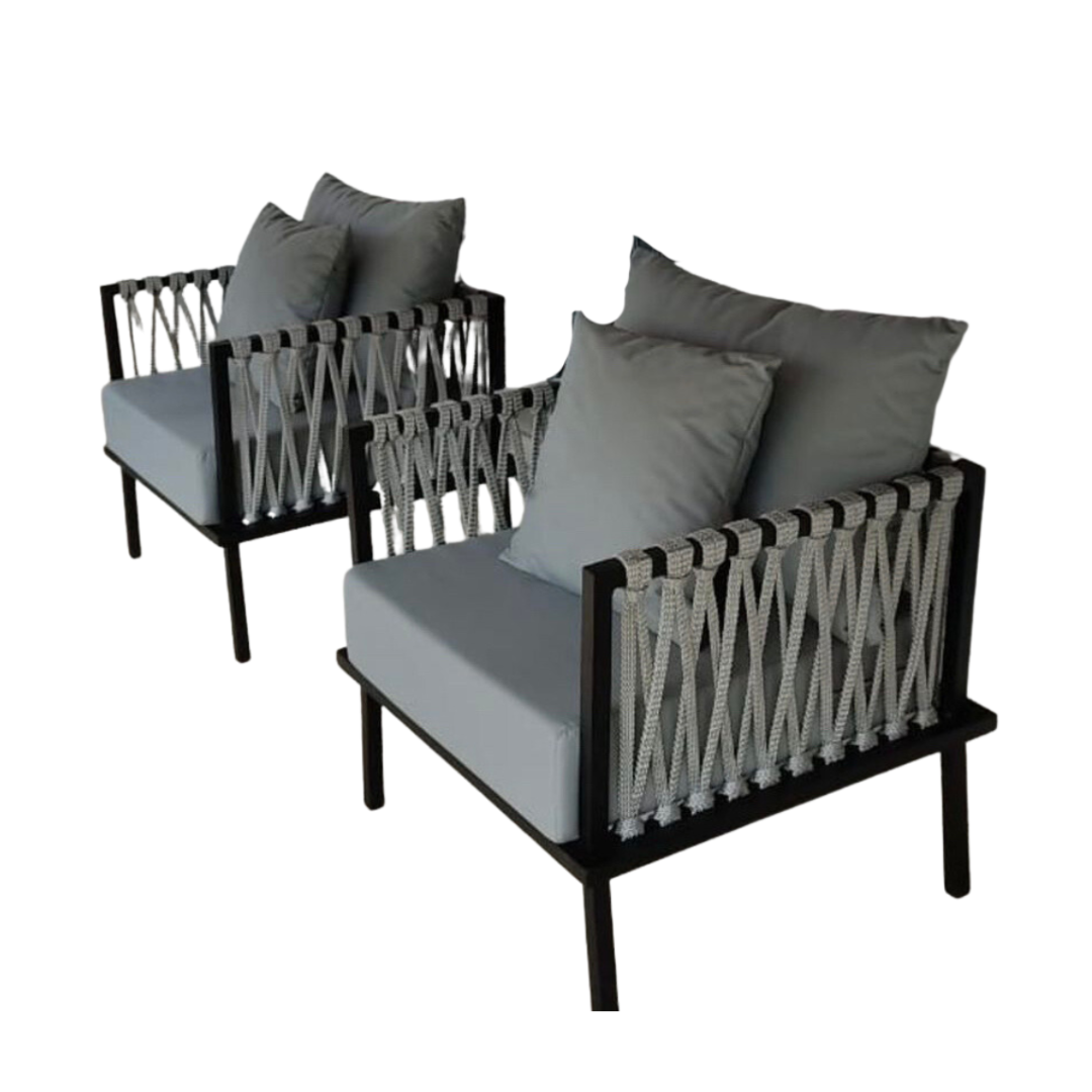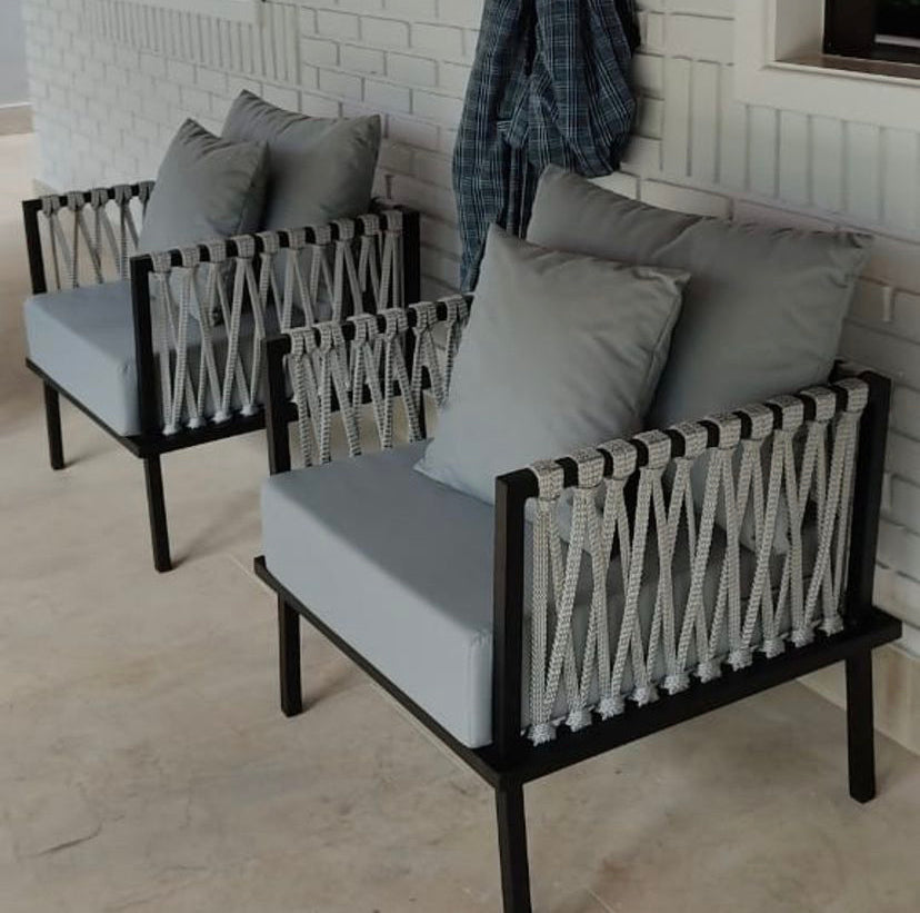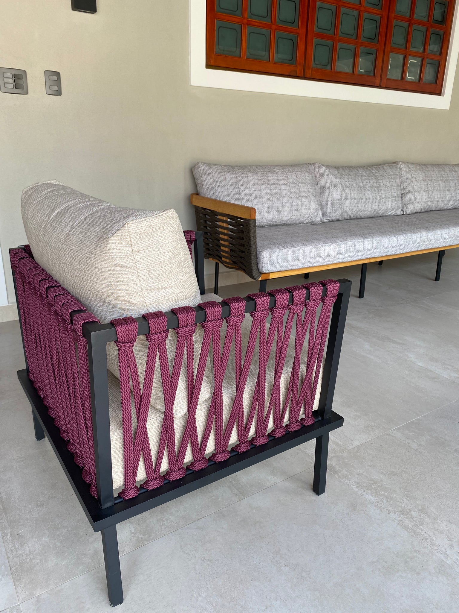Este móvel é fabricado com estrutura de alumínio soldado e confeccionado artesanalmente com fibra sintética, por isso pode ficar tanto na área interna quanto externa, sendo resistentes a sol, chuva e raios UV. O tecido usado é o AcquaBlock impermeável.